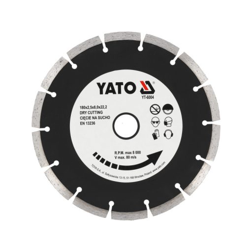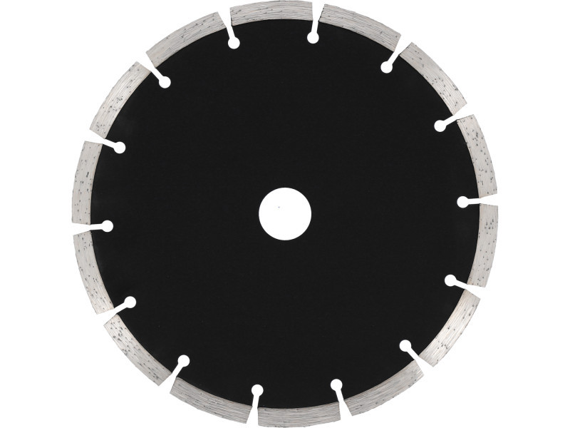 Diamond shield for angular grinders equipped with segments with a height of 8 mm laser welded. Designed for "dry" work. Recommended for cutting hardened concrete, brick, silicate brick, granite, wall, stone. Recommended speed approx. 8000 rpm.
