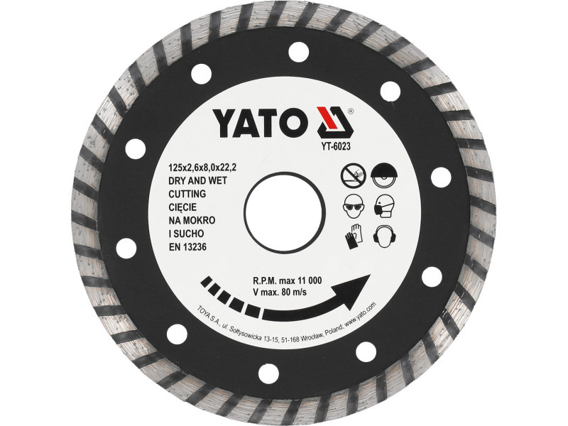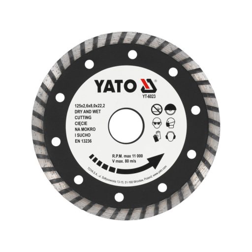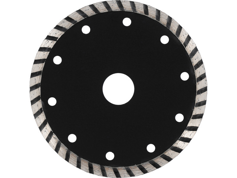 Universal diamond shield for angle grinders. Equipped with a 8 mm high turbo segment. Designed for "wet or dry" work. Recommended for cutting hardened concrete, reinforced concrete, brick, granite, wall, stone, sandstone. Recommended turnover approx. 11000 rpm