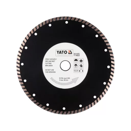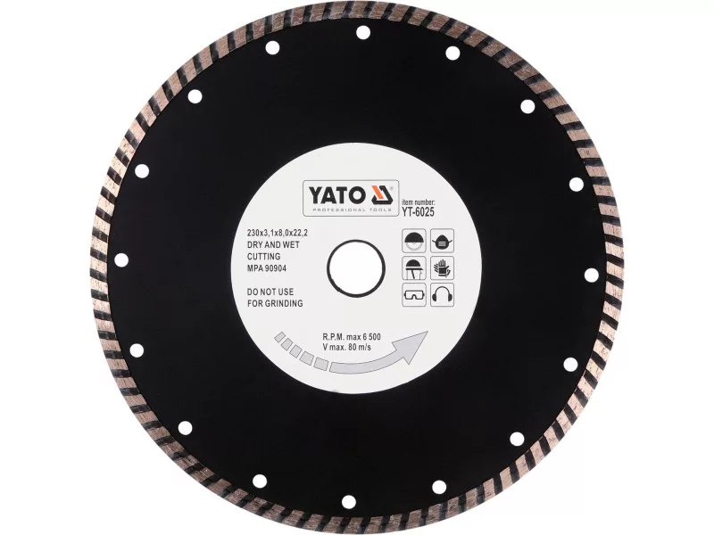 Universal diamond shield for angle grinders. Equipped with a 8 mm high turbo segment. Designed for "wet or dry" work. Recommended for cutting hardened concrete, reinforced concrete, brick, granite, wall, stone, sandstone. Recommended turnover around 6500 rpm