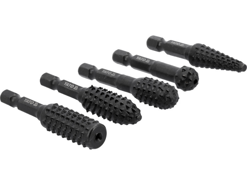 Rotary file set made of blackened carbon steel. It is used for woodworking, enlarging holes when fitting door locks, fitting carpentry joints and chamfering edges.