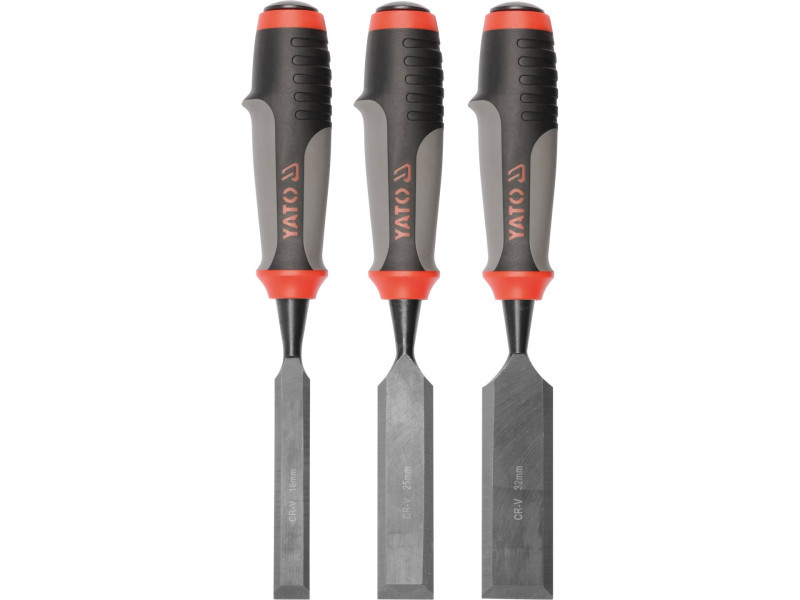 Carpentry chisels with a handle with special plastics adapted for beating. CRV steel blade. Milted blade edges. The kit includes chisels with widths of 16.25, and 32 mm. Tool surface black. Chisels for carpentry work for woodworking and some wood -based materials.