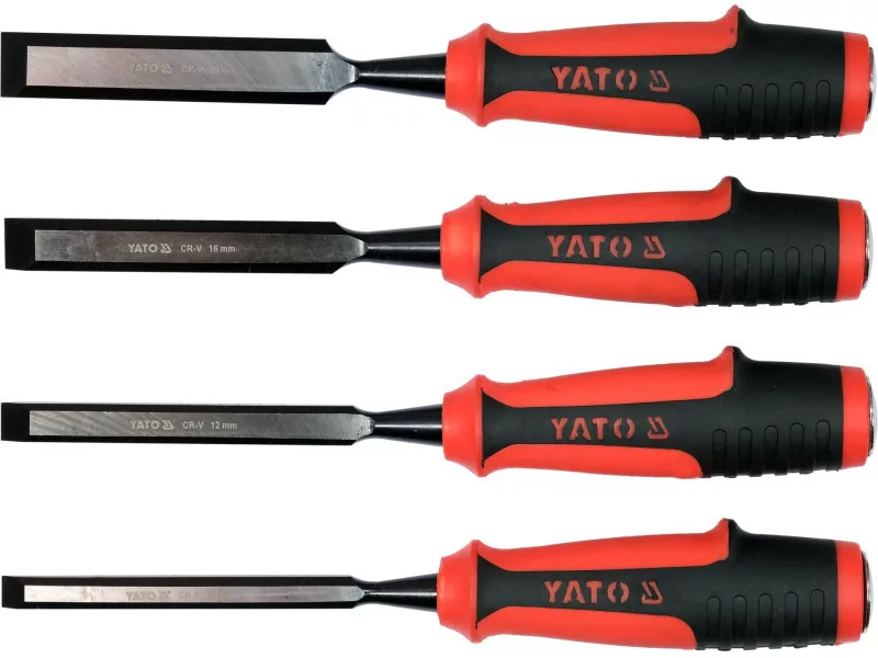 Carpentry chisels with a handle with special plastics adapted for beating. CRV steel blade. Milted blade edges. The kit includes chisels with a width of 10,12,16 and 20 mm. Tool surface black. Chisels for carpentry work for woodworking and some wood -based materials.