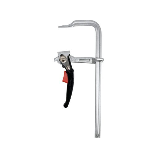 Cress with a ratchet mechanism. It guarantees a very strong, precisely graded jaw pressure. The steel structure provides quick, stable fastening, resistant to twisting and vibrations. A vacuumed, profiled guide and a ratchet mechanism can be used as an effective spreader. For professional applications in carpentry, construction works, steel constructions and welding. Put the jaws into the material and strongly press the lever. Unlocking after pressing the button.