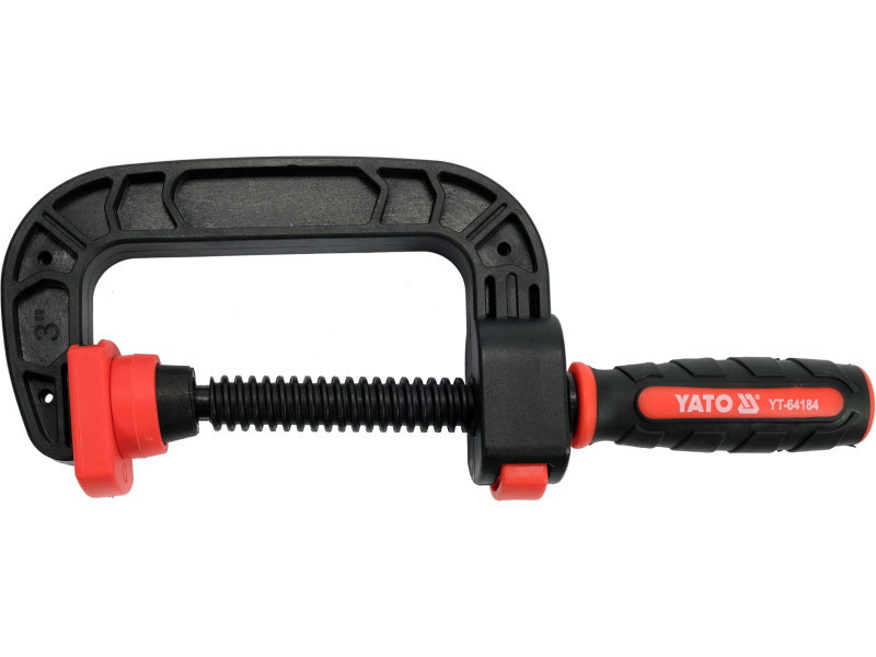 Type C screw pressure size 75 mm / 3 " / made of nylon plastic. The thickness of the profile 15 mm. It is equipped with a fast shifting system. The maximum opening is 75 mm. A depth about 70 mm. The accurate fit to the material. Pressing planes are covered with soft overlays protecting the material against damage. The pressure screw is finished with a convenient non -slip handle. For clamping the processed elements of various materials.