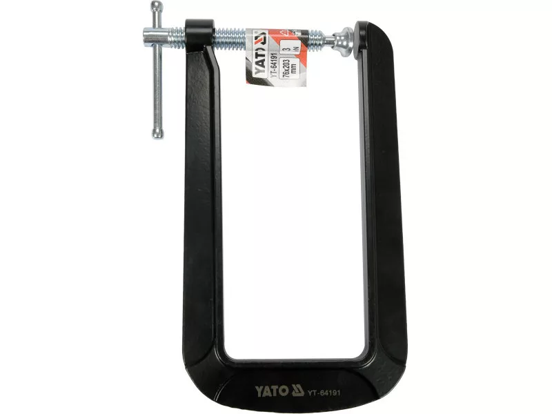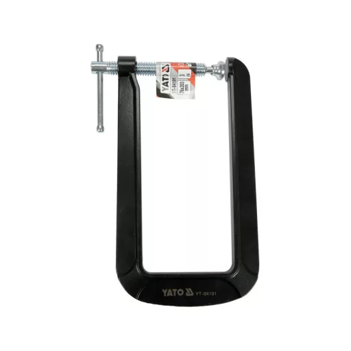 Practical and popular C -type clamps in a deep performance allow you to tighten the combined elements at a relatively large distance from the edge of the material. The clamping body is made of a ductile cast iron, protected against rust with a powder coating. Steel screw, galvanized with a movable pressure plate embedded at the stop. For the YT-64190 model, the depth is about 130 mm height about 63 mm, pressure of about 3kN, for YT-64191 depth about 203 mm, height about 76 mm, pressure force approx. 3kN. For YT-64192 depth- about 304 mm, height about 101 mm, pressure of approx. 3kN. for carpentry and assembly works
