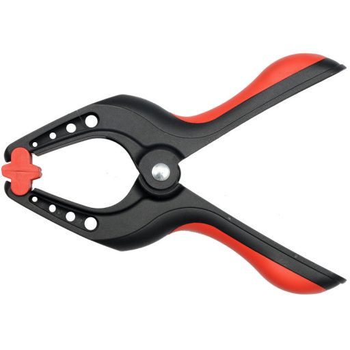 Spring clamp 150 mm. Made of plastic with a strong compression spring and movable flat compression tips. For squeezing, clamping, holding during light carpentry and finishing work such as drilling, gluing, riveting....