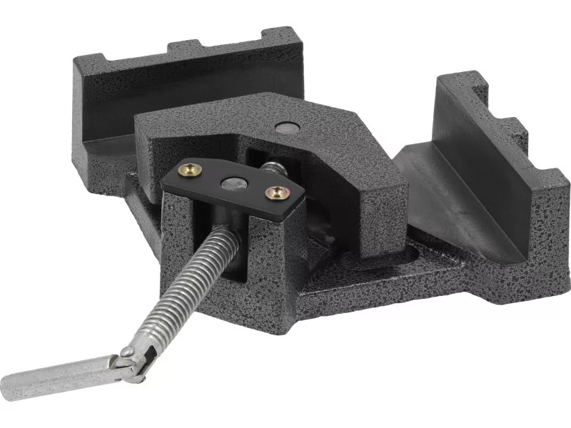 Corner clamp for securing materials at a 90° angle. The clamping screw mounted on a movable shaft allows for asymmetrical positioning of the clamping jaw, thus holding elements of different thicknesses. Used in welding, carpentry, or mechanical workshops, among others, for making connections with slats or boards.