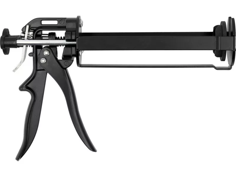 The reinforced sealant caulking gun is designed for professional application of silicones, acrylics, construction adhesives, and other materials in 300 ml cartridges. The 200 mm (9 inch) long design is intended for use with high-viscosity materials, where stability in piston movement and even material dispensing are crucial. The tool is effective in construction, assembly, and installation work, both for precise sealing and larger application ranges.