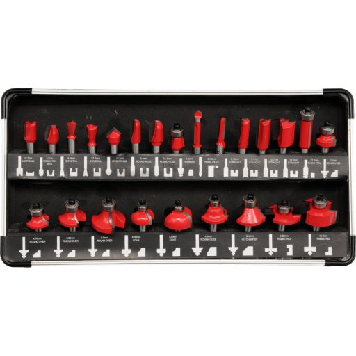 Precisely made, high -speed wood cutters. Fat fi 8 mm, heads equipped with profiled cutting tiles, made of yg6X silicon carbide. Silver soldered, dimensions tolerance 0.08 mm. Edge machining cutters equipped with bearings to facilitate the handling of a milling machine. A set of 25 cutters, collected in a functional suitcase with a glass that facilitates control and quick selection of the right tool. For precise woodworking of wood and some plastics using mining cutters.
