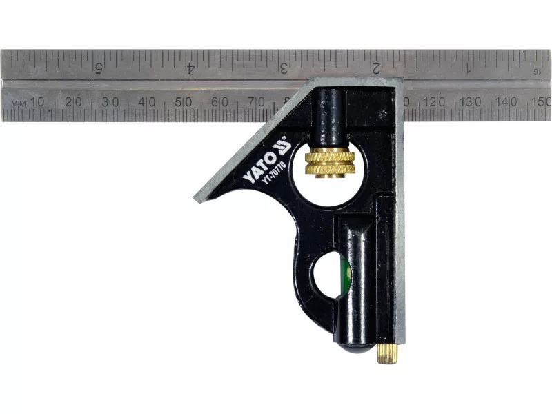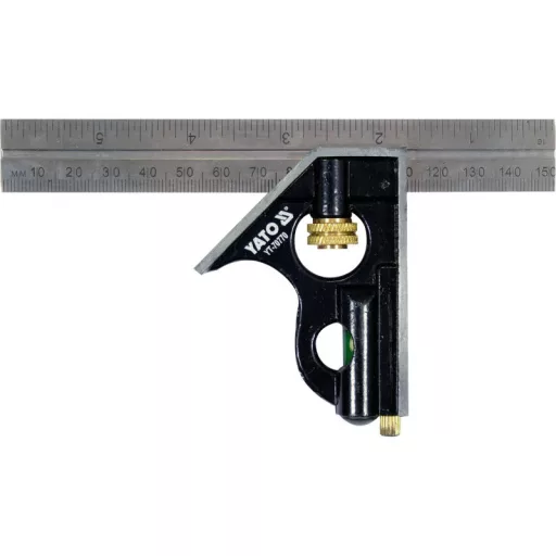 A 150mm angle bracket on stainless steel bar with milled inch and millimeter graduation.