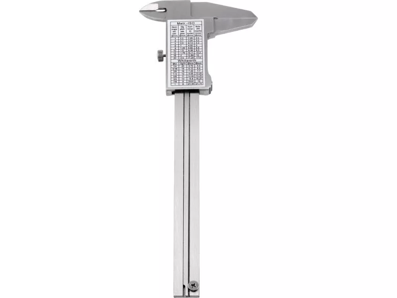 Stainless steel caliper for measuring length, height, depth and inside and outside diameter. Allows measurement in the range of 0-100 mm with an accuracy of 0.05 mm. Clear and legible graduation provides accuracy and ease of reading the indicated values.