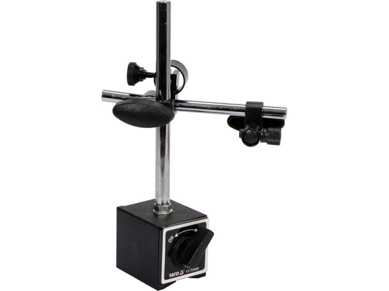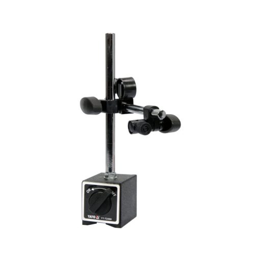 Professional magnetic stand YT-72460 for dial sensors YT-72450 and YT-72453. It has a spring joint for accurate positioning of the dial sensor on the measured part. Centrally locks the middle and upper joint at the same time with a knob. Magnetic base with prismatic groove on the underside. High pulling force ensures stable and secure connection with metal parts - detachment of the element is realized by a special knob.