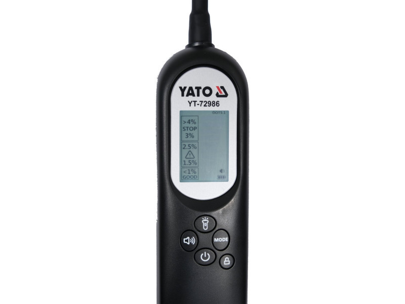 Brake fluid tester DOT3, DOT4, DOT5.1. Easy reading of the results thanks to the large liquid crystal display. Ergonomics of use is provided by the flexible probe with a length of 21 cm. The tester is powered by a 600 mAh rechargeable battery charged with a USB type C cable.