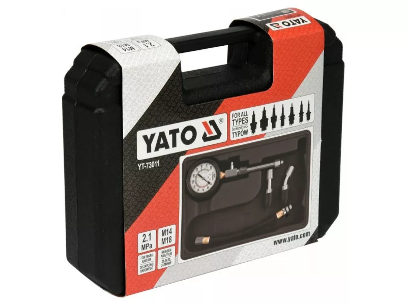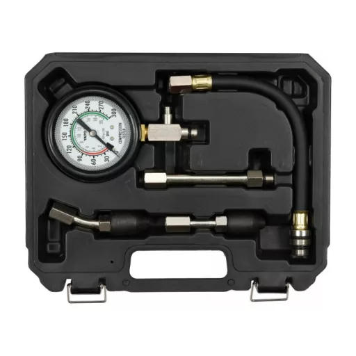 A five-piece kit designed to measure compression pressure in spark ignition engines. Recommended for automotive and mechanical services.
