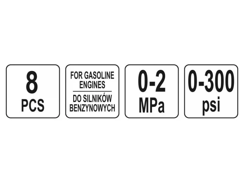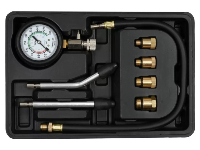 8-part set for measuring compression pressure in gasoline engines. AMA with a scale of 0-300 PSI and 0-2 MPA equipped with ZA & oacute; R4 replaceable brass adapters matching most brands of car & oacute; W2 interchangeable extensions & ndash; simple and bent & ndash; Ended with rubber -elastic rewrite with a length of 500 mmzapacked in a handy suitcase