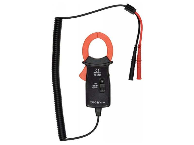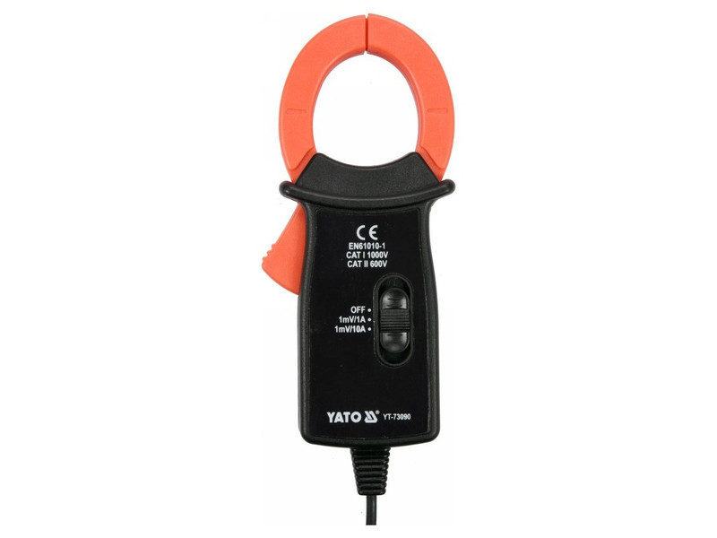 YT-73090 clamp meter equipped with clamps to measure AC current in a single wire by inductive method. This makes it possible to measure much higher current than conventional electric meters. The meter is a complementary accessory to the YT-73085 universal meter, as well as any universal meter that measures in the millivolt range.