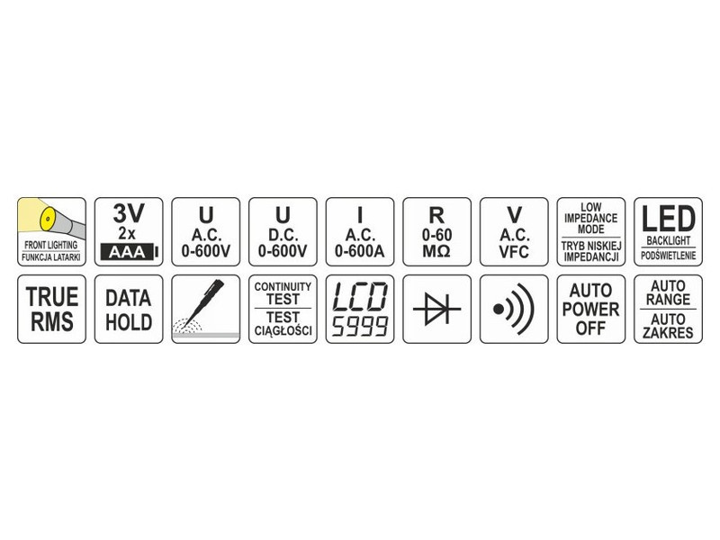 - AC voltage measurement: A.C. 0-600 V, TRUE RMS + V.F.C. + lowZ