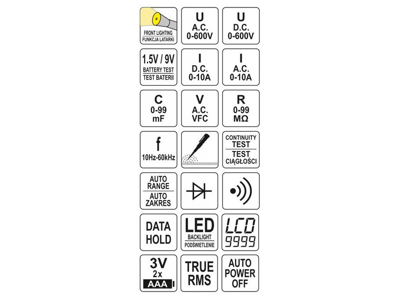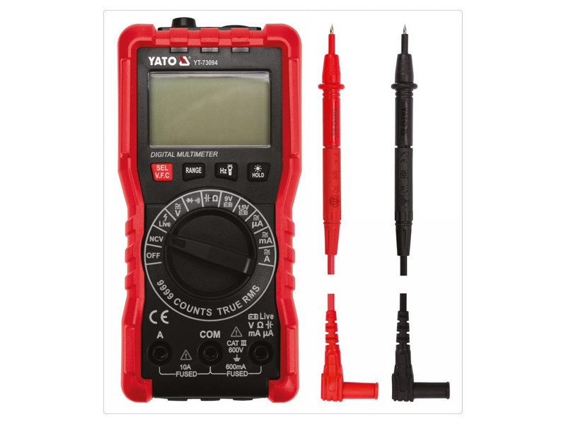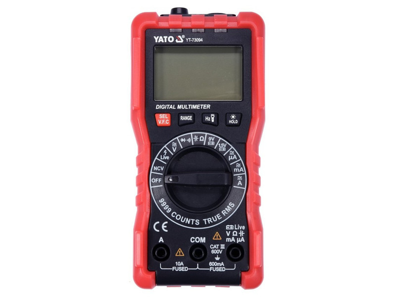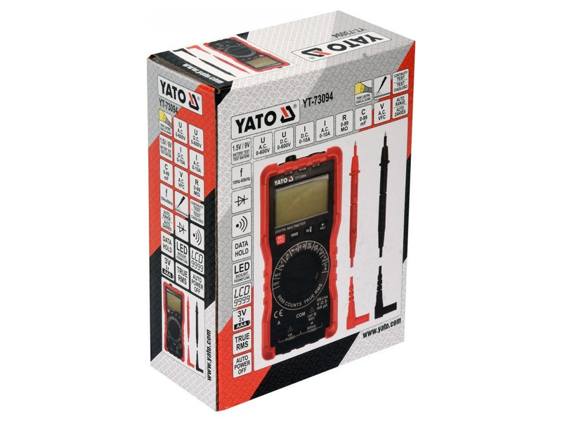 The YT-73094 universal meter with TRUE RMS function and automatic range for each measurement allows you to perform basic and advanced electrical measurements. An additional and useful option is the ability to detect AC voltage without contact, as well as detect the phase wire through the insulation. With the 1.5V and 9V battery test, we can check the voltage of the battery under load, this will help to assess its condition and exclude or confirm the need for replacement.