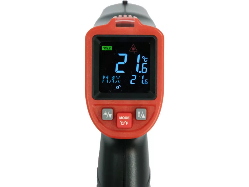 The YT-73201 non-contact infrared thermometer with a large color LCD display, expanded circular laser sight, emissivity adjustment, additional UV light for fluorescent leak detection, and numerous functions for easy operation, including max/min, continuous measurement, and storage of the last 100 measurements. It will find its use in many industries, including construction, automotive, food service, as well as household.