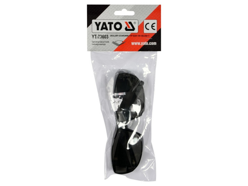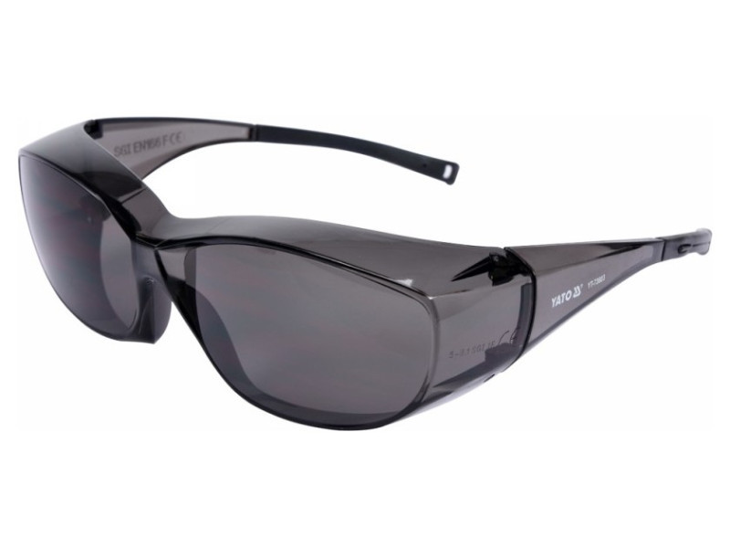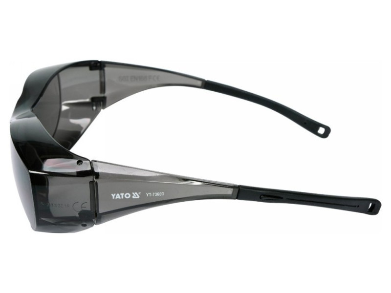 Protective eyewear YT-73603 designed for eye protection in manual and mechanical work. The "fit over" frame design allows the róon to wear corrective glasses.