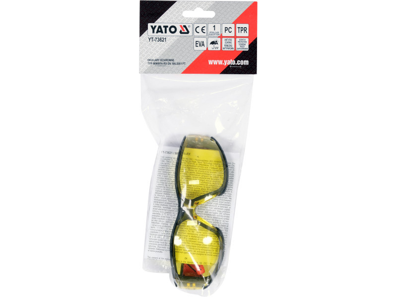Protective eyeglasses YT-73621 with zólated lenses housed in comfort-enhanced frames. The yellow tinting filters out a wide spectrum of blue light, which in effect increases the contrast of the objects being viewedóly. This allows you to better focus on doing precision work, not just outdoors. The lenses have been coated with anti-fog and anti-scratch* coatings. The former prevents fogging of the glassesó the latter protects against excessive scratching. Glasses of the highest optical class do not distort the image, and also protectós from harmful UV radiation. The frames have been retrofitted with a removable EVA foam frame, whichóra reduces contact of hard elementsóaround the eyes. Weighing just 31 gramsóing, the soft, flexible, non-slip temple endsów make the glassesów almost impossible to feel on the head.