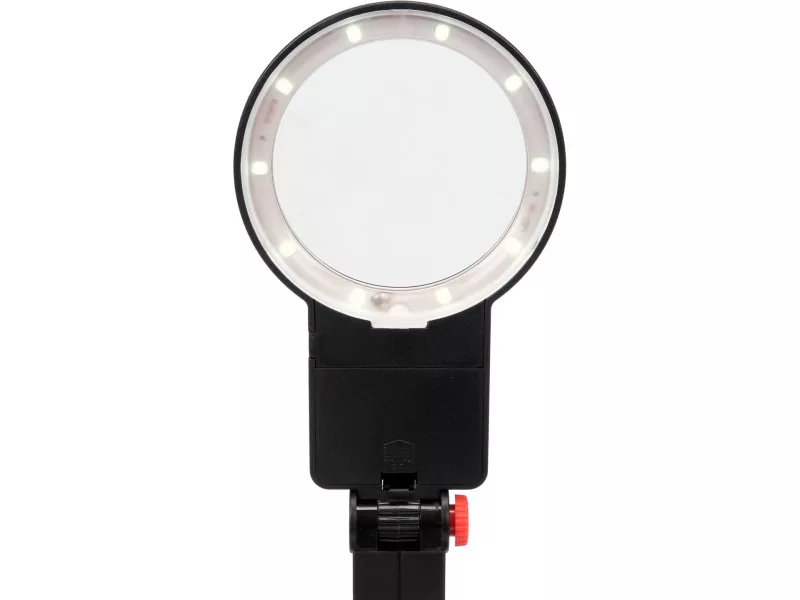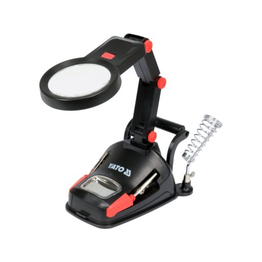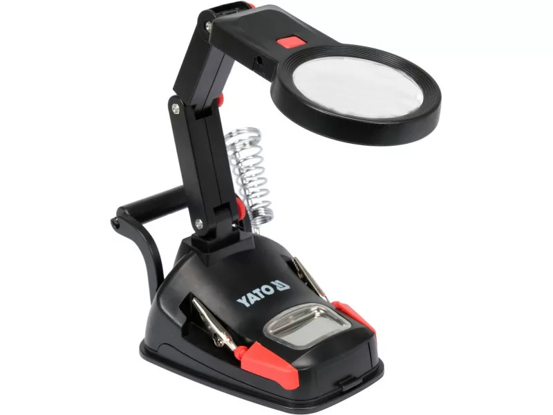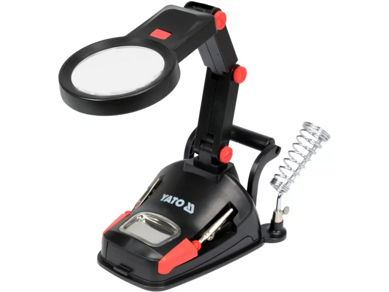 Third-hand type handle with ring-shaped illumination from 10 LEDs. Dual magnifier - the larger one with a diameter of 75 mm provides a magnification of x 3. The smaller magnifier - built-in, with a diameter of 20 mm magnifies the image x 4.5. The 360-degree swivel arm with angle adjustment in three places allows you to work freely both inside and outside the auxiliary clip area. Two crocodile clips mounted on the movable arms and on double ball joints provide a wide range of possibilities for adjusting the clips to both fine jewelry and small PCB sizes. A soldering sponge stand, a flask slot, a roll for mounting solder binder and a storage compartment, e.g. for disassembly screws, help organize your work.