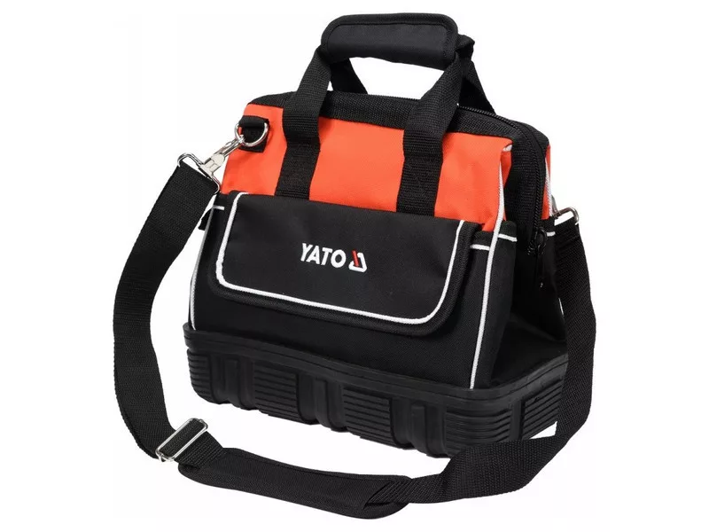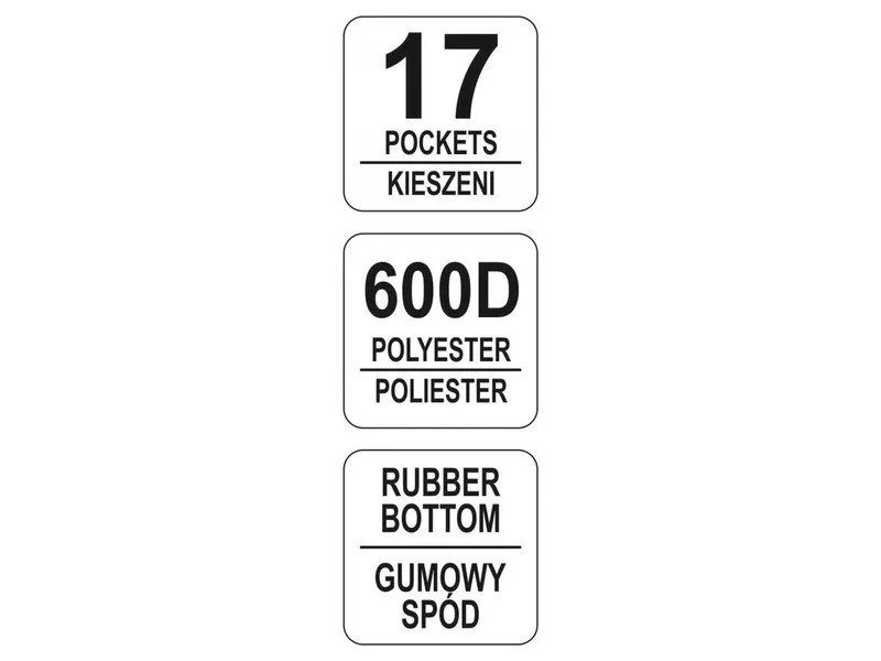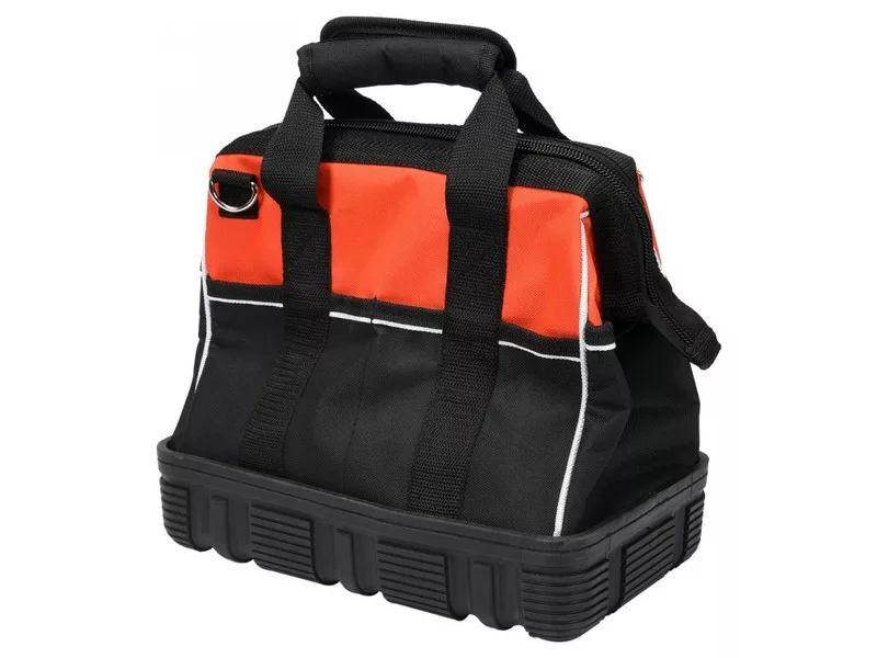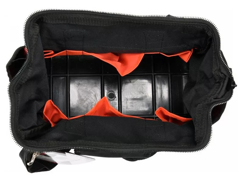 Capacious, functional, tool bag made of technical polyester 600 D The bottom of the bag is waterproof, made of strong, flexible polypropylene-based plastic The seams and the main zipper are reinforced, designed to withstand heavy loads. Central handle with Velcro flap and attachable belt for easy transport. Fitted with 17 pockets of various sizes and purposes. A special type of closure, reinforced with metal strips, allows full opening and quick access to the inside of the bag. Designed to carry power tools, hand tools and accessories directly to the workstation . For storing or transporting tools .