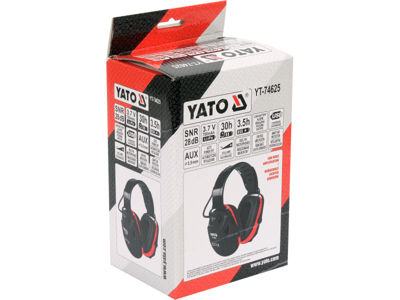 Active anti-noise earmuffs YT-74625 with a smart module that amplifies quiet ambient sounds. When wearing the earmuffs with the module activated, we can hear similarly as without it. However, if the ambient sound level exceeds 82dB, then the intelligent hearing protection will react instantly and disconnect the module for the duration of the excessive noise. Operating the ear muffs with the module turned off guarantees a 28dB reduction in noise levels.