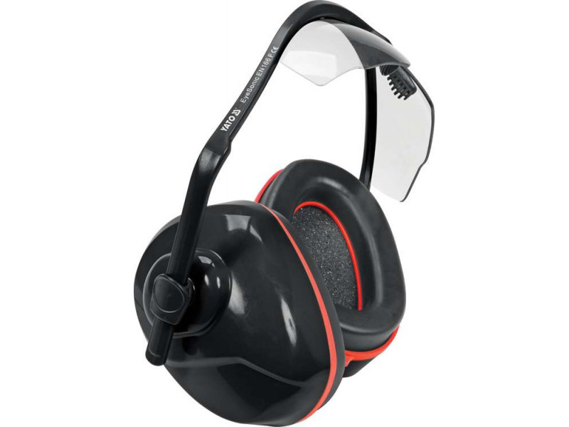 Earmuffs integrated with interchangeable clear safety glasses YT-74636 protect not only hearing but also the user's eyes. Eyeguards with adjustable ball joints at the same time act as a headband, which makes it possible to work, for example, in a protective helmet without additional pressure on the head.