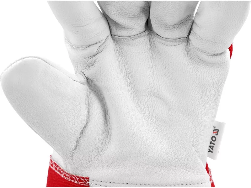 Construction gloves made of natural leather and cotton knitted fabric in red. The high quality of goat grain leather makes the gloves very pleasant to the touch, and the hands do not sweat excessively. They will prove especially useful when doing heavy construction work, in the garden, as well as wherever high precision grip is not required. grip part: natural grain leather upper part: leather and cotton knitted fabric cuff made of laminated cotton knitted fabric.