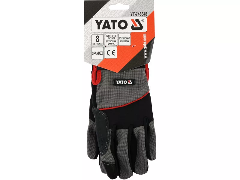 Made of synthetic leather, double-layer fabric with spandex addition, and neoprene. Synthetic leather with additional reinforcements and silicone coating in the gripping part guarantee high durability, good fit to the hand, and above all strengthen the grip. Neoprene on the knuckles stretches and works with hand bends. A terry cloth fabric on the thumb for wiping sweat. The double-layer fabric on the top made of durable nylon with the addition of a material giving it elasticity not only provides good protection against mechanical hazards but also high work comfort.