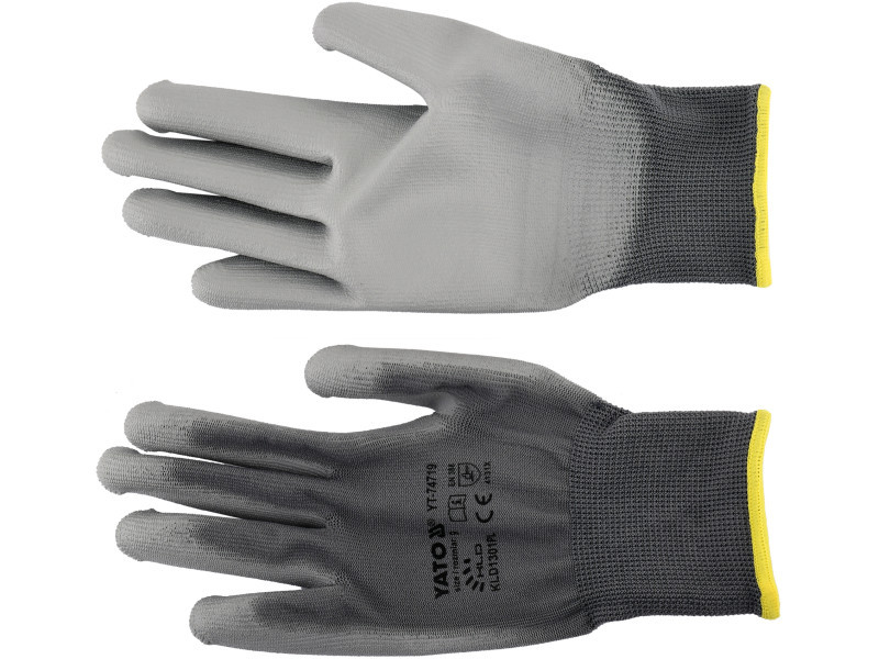 Protective work gloves made of gray polyester, coated in the grip part with gray polyurethane. The thickness of the coating provides almost the highest abrasion resistance according to EN 388. Seamless construction with high quality polyester guarantees increased tear resistance.