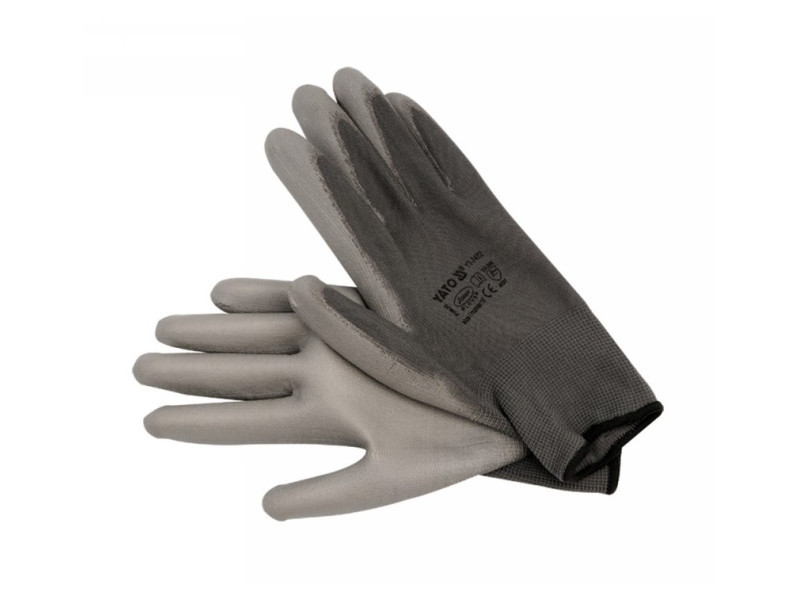 Protective work gloves made of gray polyester, coated in the grip part with gray polyurethane. The thickness of the coating provides almost the highest abrasion resistance according to EN 388. Seamless construction with high quality polyester guarantees increased tear resistance.