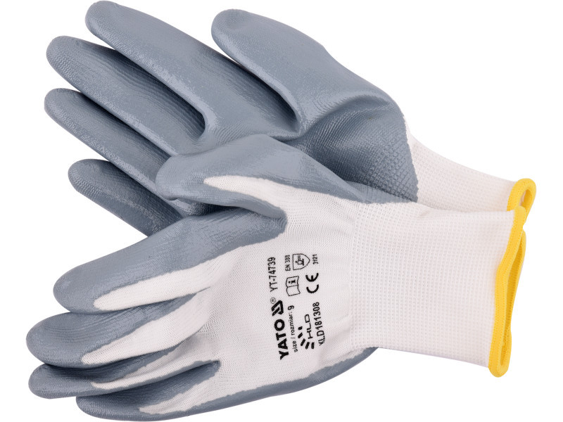 Protective work gloves made of white nylon, coated in the grasping part with gray nitrile. A sufficiently thick coating layer provides almost the highest abrasion resistance according to EN 388. An additional advantage of nitrile is resistance to gasoline, diesel, paraffin, solvents, lubricants, etc. The seamless structure of the basic quality of nylon guarantees good resistance to tearing and maintaining flexibility for a long time. Casting part: Nitril coating outer part: nylon stitch: 13g flexible cuff
