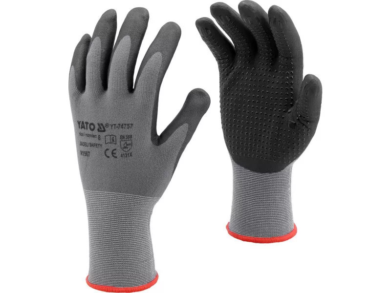 Protective work gloves made of dark gray nylon with the addition of spandex, coated in the gripping part foamed black nitrile with a nitrile dotty. An additional advantage of nitrile is resistance to gasoline, diesel, paraffin, solvents, lubricants, etc. Seamless construction of high -quality nylon is increased resistance to tearing and maintaining flexibility for a long time. A small 15g stitch, i.e. 15 stitches per inch, is a lower weight and even better adhesion to the hand. Nitrile anti -slip pronunciation strengthens the grip and confidence in holding dry objects. Casting part: coated with foamed nitrile with an additional ilter from nitrile dots, outer part: nylon with the addition of spandex stitch: 15g flexible cuff & nbsp;