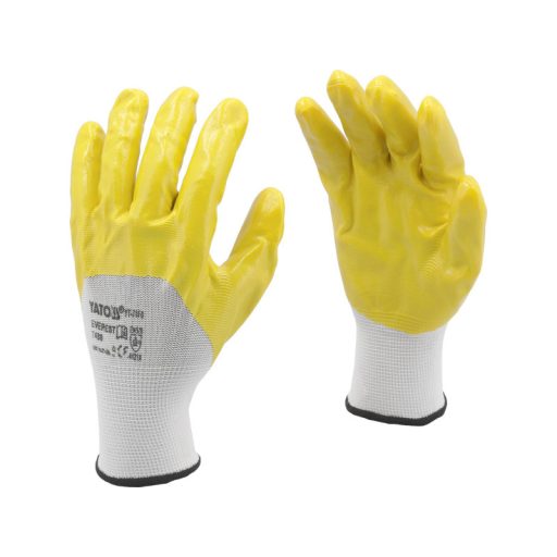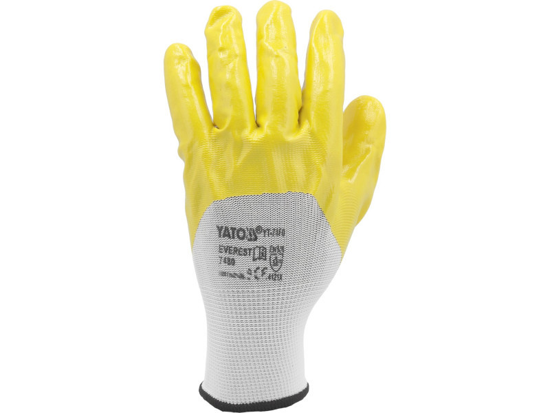 Protective work gloves made of white polyester, coated in the gripping part, as well as partially in the upper part with yellow nitrile. A suitably thick coating layer provides the highest abrasion resistance according to EN 388 standard. An additional advantage of nitrile is resistance to gasoline, diesel fuel, paraffin, solvents, greases, etc. The seamless construction of basic quality polyester ensures good tear resistance.