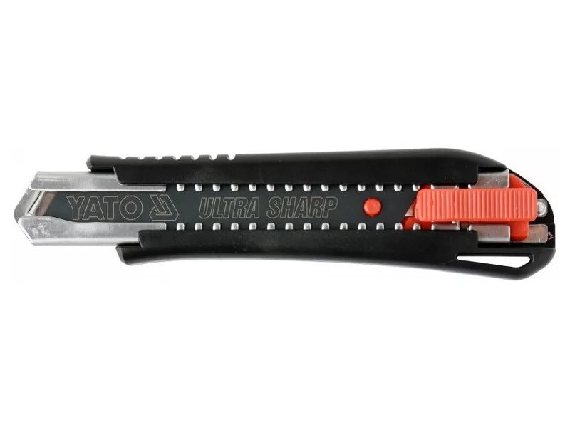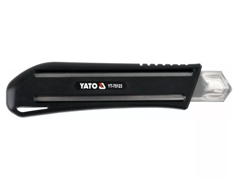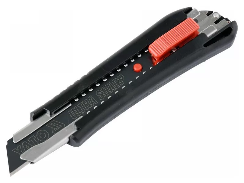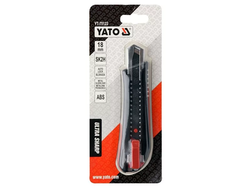Knife with 18mm broken blade by Yato YT-75123. The blades made of Ultra Sharp SK2H steel covered with a special black coating guarantee exceptional sharpness, a corps of resistant ABS plastic. Handle additionally coated with a non -slip draft made of TPR. This provides a certain grip and high comfort of work. The metal guide provides smooth and trouble -free operation. In addition, it is equipped with the "Auto Lock" system, which protects the blade against accidental extending or retraction during operation, withstanding strength to 20N. Thanks to the "Auto Lock" system, the knife is perfect for cutting thick materials or in narrow gaps, in which there is a risk of jamming the blade.