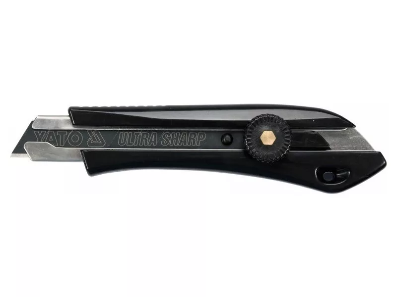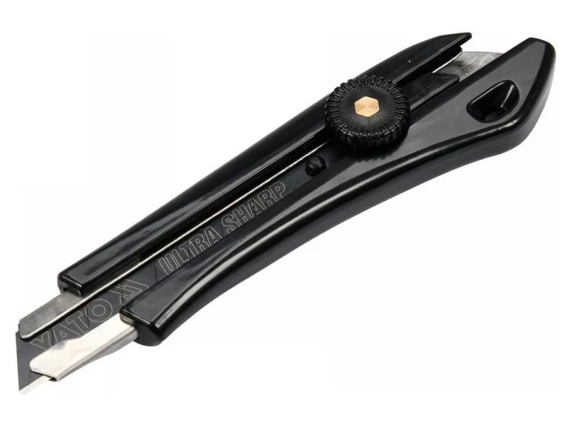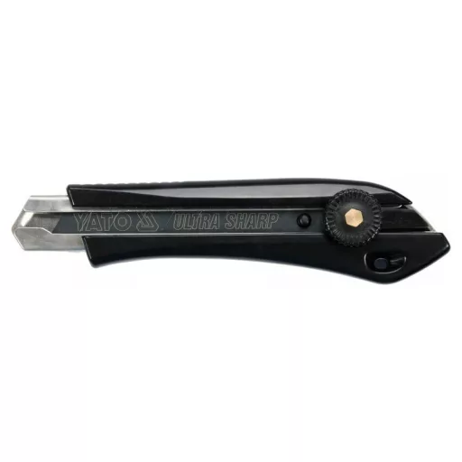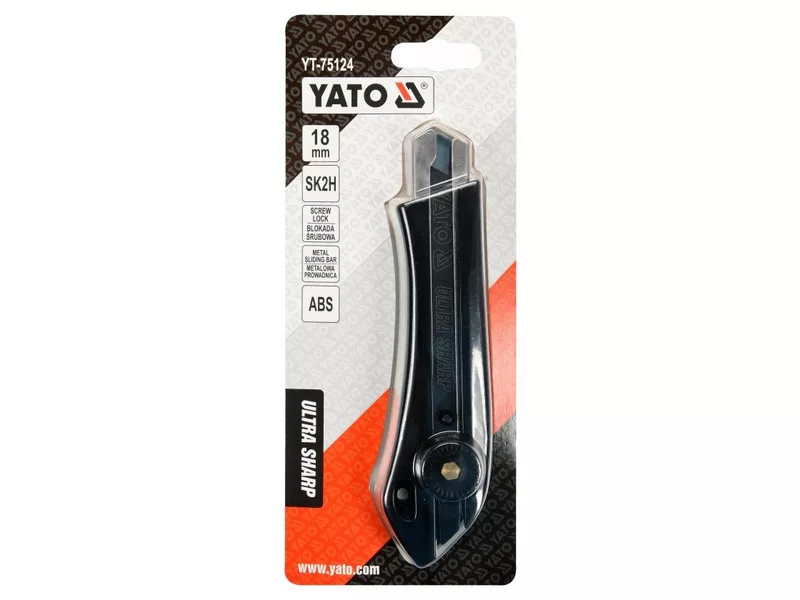 A knife with 18mm broken blade by Yato YT-75124. The blades made of Ultra Sharp SK2H steel covered with a special black coating guarantee exceptional sharpness, a corps of resistant ABS plastic. Handle additionally coated with a non -slip draft made of TPR. This provides a certain grip and high comfort of work. The metal guide provides smooth and trouble -free operation. In addition, it is equipped with the "Auto Lock" system, which protects the blade against accidental extending or retraction during operation, withstanding strength to 20N. Thanks to the "Auto Lock" system, the knife is perfect for cutting thick materials or in narrow gaps, in which there is a risk of jamming the blade.