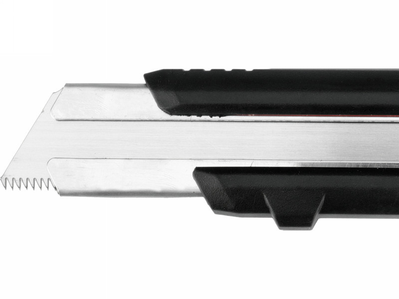 Saw blade knife designed for cutting fibrous materials and plastics, where standard smooth blade has limited effectiveness. The serrated cutting edge made of SK5 steel facilitates starting the cut and reduces tool slippage on the surface. The ABS housing reinforced with TPR rubber improves grip and stability during use.