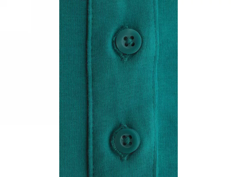 A traditional tshirt jersey knit, it is more pleasant to the touch than the two-ply pica knit popularly used in polos. Sometimes pica shrinks unevenly after washing, making it difficult to maintain the perfect cut. High-weight jersey is a guarantee of comfort and good looks. The combination of collar, welt and button placket is an unconventional fleece look and the comfort of a quality T-shirt.