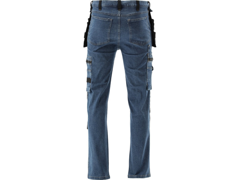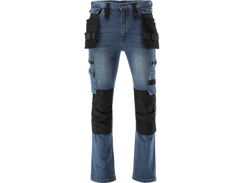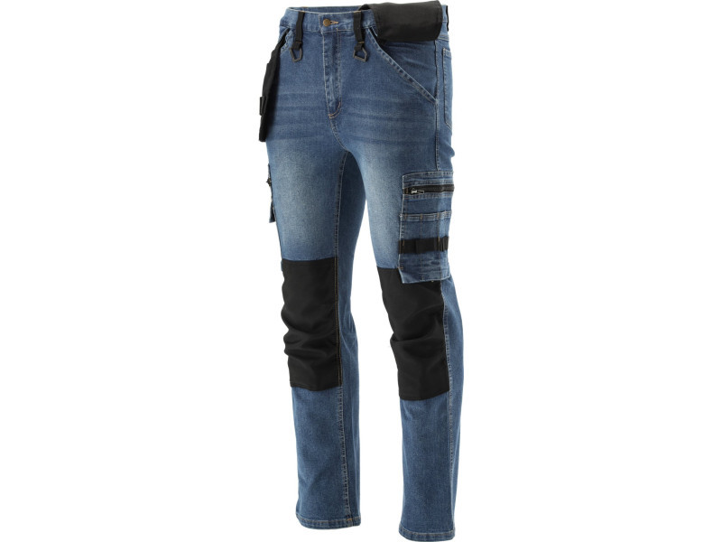 Fitter's work trousers with elastane made of rubbed and stretch denim. As many as seventeen pockets, including one with a Velcro fastening, two with a zip fastening and two detachable mounting pockets. A large number of basic pockets and fitting pockets made of robust material will help organise the work of a carpenter, roofer or plumber.