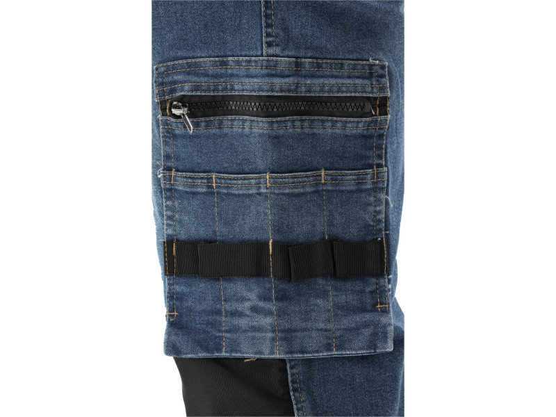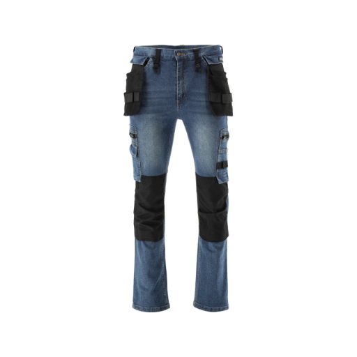 Work trousers for installers made with elastane from worn and stretchable denim. A total of seventeen pockets, including one with a Velcro closure, two with zippers, and two detachable installer pockets. The large number of basic pockets and the durable material of the installer pockets will help organize the work of carpenters, roofers, or plumbers.