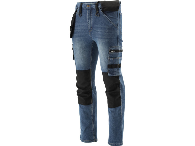 Work trousers for installers made with elastane from worn and stretchable denim. A total of seventeen pockets, including one with a Velcro closure, two with zippers, and two detachable installer pockets. The large number of basic pockets and the durable material of the installer pockets will help organize the work of carpenters, roofers, or plumbers.