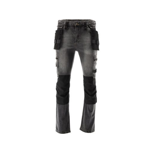 Fitter's work trousers with elastane made of rubbed and stretch denim. As many as seventeen pockets, including one with a Velcro fastening, two with a zip fastening and two detachable mounting pockets. A large number of basic pockets and assembler pockets in robust material will help organise the work of the carpenter, roofer or plumber.