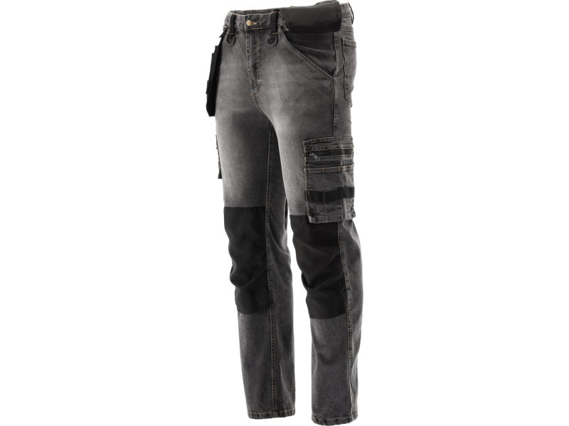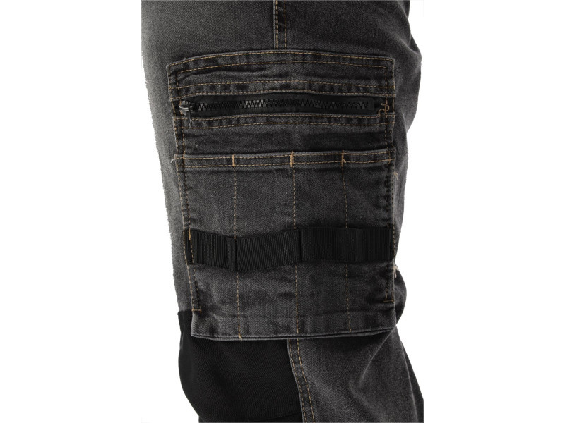 Fitter's work trousers with elastane made of rubbed and stretch denim. As many as seventeen pockets, including one with a Velcro fastening, two with a zip fastening and two detachable mounting pockets. A large number of basic pockets and assembler pockets in robust material will help organise the work of the carpenter, roofer or plumber.
