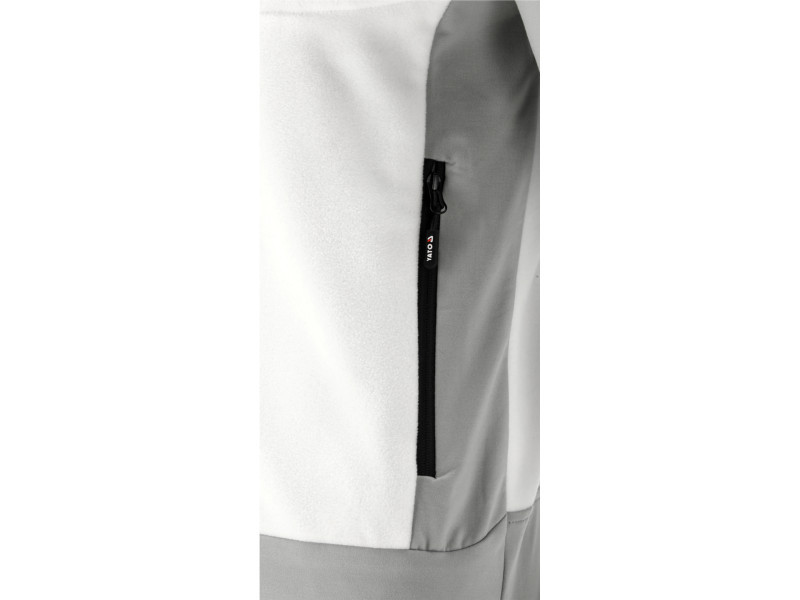 The main material is durable polyester with a characteristic fleece structure, which effectively retains body heat. The insert material is stretchable, breathable 2-way stretch fabric. It does not restrict movement and is pleasant for the skin.
