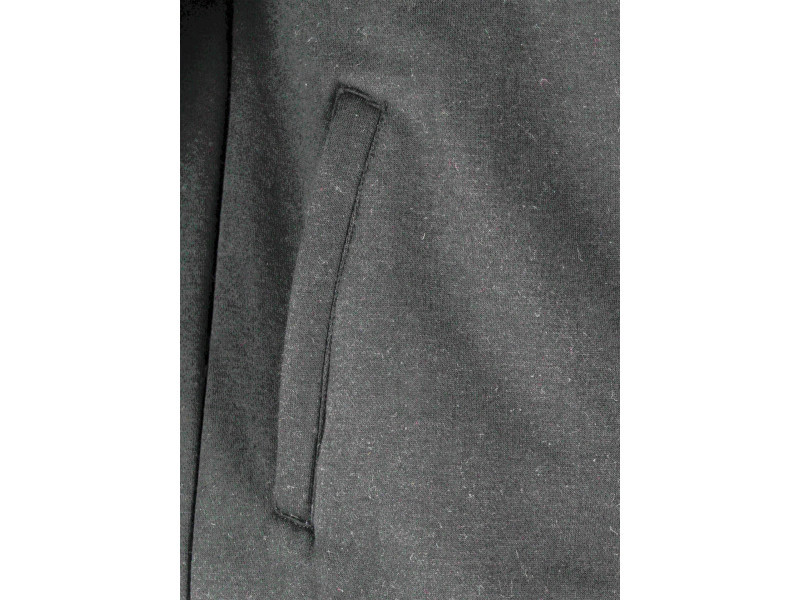 Hooded sweatshirt with two zippered pockets around the waist. The material is thick and warm cotton with a polyester blend. Cotton as a natural material is very pleasant to the touch, and at this weight provides optimal thermal comfort both in spring and autumn. The addition of polyester strengthens the fiber, thereby improving the material's resistance to tearing. Additional quilted material on both shoulders will cushion the pressure, for example, from a carried bag of cement. Special prints made with reflective ink improve the user's visibility.