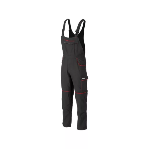 Nine pockets, including a large chest pocket with a zipper closure and a loop for a hammer, will help in organizing work. Material braces with adjustment and elastic tape at the back. Buttons with width adjustment on the sides, and an elastic drawstring sewn at the back of the waist. Knee pockets with Velcro closure. Pants in a dark color with red lines, which, in addition to their decorative function, strengthen and protect the edges of the open pockets from tearing.