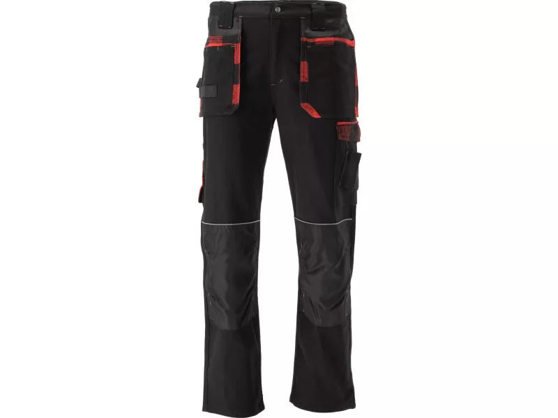 Mounting pants with elastane with fourteen pockets, including two with a Velcro fastener and one for a latch. A large amount of basic pockets and assembly pockets made of durable material will help organize a carpenter, roofer or plumbing in the organization. The main material is cotton with the addition of elastane. Cotton as a natural material is very well tolerated by the body, the skin breathes well, and with a sufficiently large weight and technique of weaving and sewing, satisfactory resistance to tear is obtained. Another of the advantages is a higher degree of protection against sparks derived, e.g. from metal cutting compared to plastic materials. Elastane affects the extension and makes the pants better adapt to the body. Red-white flannel material on pockets has a decorative function, while at the back under the belt improves comfort, fit and thermal properties in this part of the body. Basic data: material: 97% cotton, 3% elastane Weight: 300 g/m² work organization: below the belt at the front two multi-assembly with a total of 6 pockets and two loops for tools under assembly pockets two large main pockets on the left leg Two pockets with a flap, fastened with Velcro on the right leg two narrow pockets, e.g. for a knife and a wooden measuring cup, and a hammer loop below the waist below the belt two large pockets, including one with a flap with a fastener with a latch on the knees pockets from fabric resistant to abrasion with abrasion with intended for nonsense inserts, e.g. 74595 Additional information: double seams and multiple straps in places exposed to tear fastened with a zipper and a brass button in the waist on the sides sewn sewn gum, pulling wild bricks on the belt four reflective lines improving visibility, two on rear pockets and two On the pockets for the nutrient, they meet the requirements of Regulation (EU) 2016/425 for work clothing and category.