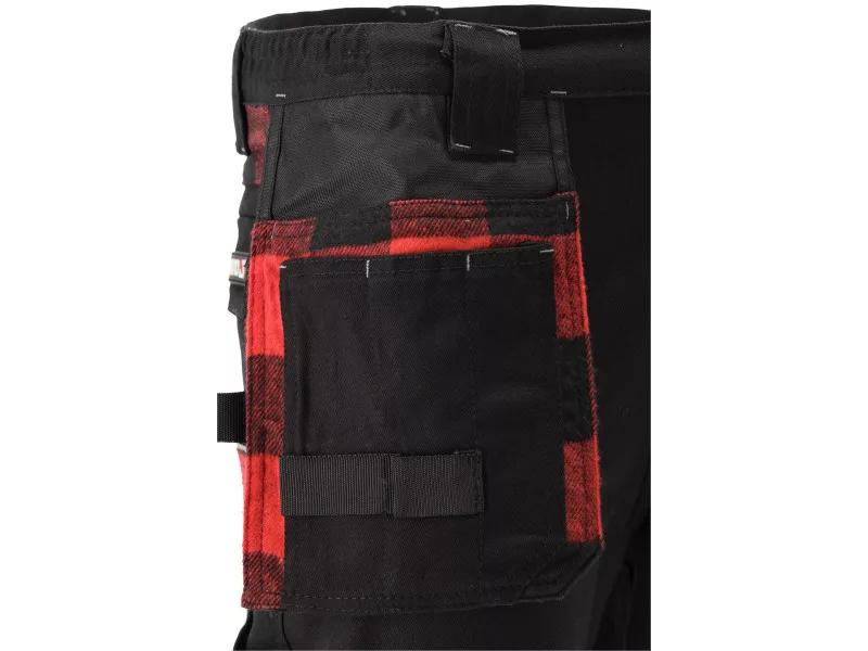 Mounting pants with elastane with fourteen pockets, including two with a Velcro fastener and one for a latch. A large amount of basic pockets and assembly pockets made of durable material will help organize a carpenter, roofer or plumbing in the organization. The main material is cotton with the addition of elastane. Cotton as a natural material is very well tolerated by the body, the skin breathes well, and with a sufficiently large weight and technique of weaving and sewing, satisfactory resistance to tear is obtained. Another of the advantages is a higher degree of protection against sparks derived, e.g. from metal cutting compared to plastic materials. Elastane affects the extension and makes the pants better adapt to the body. Red-white flannel material on pockets has a decorative function, while at the back under the belt improves comfort, fit and thermal properties in this part of the body. Basic data: material: 97% cotton, 3% elastane Weight: 300 g/m² work organization: below the belt at the front two multi-assembly with a total of 6 pockets and two loops for tools under assembly pockets two large main pockets on the left leg Two pockets with a flap, fastened with Velcro on the right leg two narrow pockets, e.g. for a knife and a wooden measuring cup, and a hammer loop below the waist below the belt two large pockets, including one with a flap with a fastener with a latch on the knees pockets from fabric resistant to abrasion with abrasion with intended for nonsense inserts, e.g. 74595 Additional information: double seams and multiple straps in places exposed to tear fastened with a zipper and a brass button in the waist on the sides sewn sewn gum, pulling wild bricks on the belt four reflective lines improving visibility, two on rear pockets and two On the pockets for the nutrient, they meet the requirements of Regulation (EU) 2016/425 for work clothing and category.